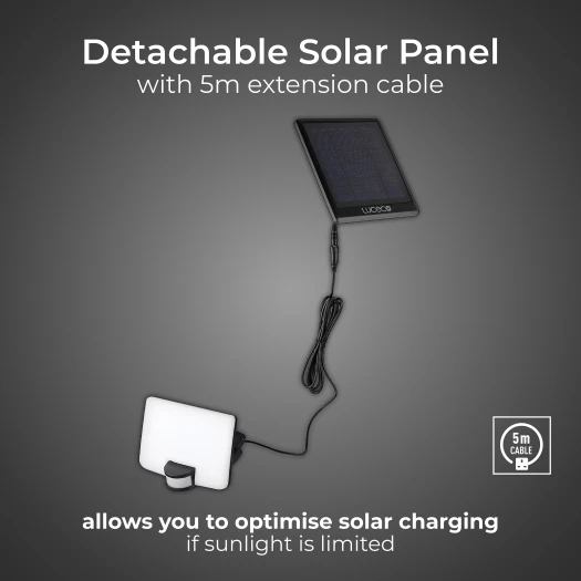 Designed for flexibility, the detachable solar panel with a 5m extension cable allows you to position it for maximum sunlight and consistent performance. The built-in PIR motion sensor detects movement up to 10 metres with a 120° angle, automatically activating for added security and convenience.